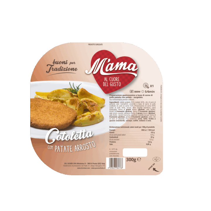 Ingredients: grilled potatoes [potatoes 96%, sunflower oil, salt, rosemary], chicken meat product consisting of meat part 40% [meat preparation 65% [chicken breast 84%, water, vegetable fibers (bamboo), breadcrumbs (wheat flour (gluten), salt, yeast), wheat starch (gluten), wheat flour (gluten), salt, flavorings, spices], breading [wheat flour (gluten), salt, yeast, spices (turmeric, paprika)], batter [water, wheat flour (gluten), wheat starch (gluten), salt], sunflower oil}. May contain egg, milk, nuts (almonds), mustard, sulphites, celery and soy.