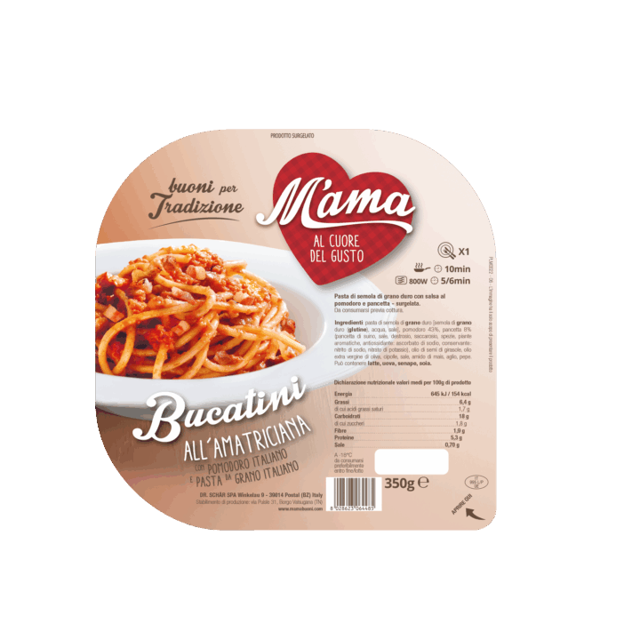 Ingredients: durum wheat semolina pasta [durum wheat semolina (gluten), water, salt], tomato 40% bacon 10% (bacon of pork, salt, dextrose, sucrose, spices, antioxidant: sodium ascorbate, preservative: sodium nitrite, potassium nitrate), extra virgin olive oil, onions, vegetable oils (sunflower, rapeseed, olive, extra virgin olive oil, soya), salt, garlic, maize starch, pepper. May contain traces of milk, eggs and mustard.