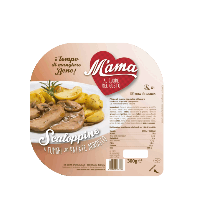 IngredientsCooked pork 30% (equivalent to 40.5% raw), potatoes 36%, champignons 17% (Agaricus bisporus), cream (milk), sunflower seed oil, wheat flour (gluten), salt, butter (milk), white wine, dried porcini mushrooms 0.4% (Boletus edulis and related group), extra virgin olive oil, parsley, aromatic plants 0.2%, lactose (milk), rice flour, vegetable protein (sunflower), onion, maize starch, garlic. May contain traces of soya and mustard.