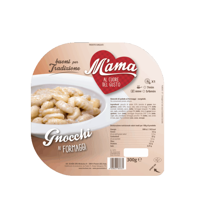 Ingredients: potato dumplings 63% (durum wheat semolina (gluten), potato 30%, water, salt), cheese sauce 37% (rehydrated skim milk,  cream (milk), bergader cheese 7% (milk, salt, rennet, penicillium),  cheese 6%  (milk), wheat flour (gluten), butter (milk), Gorgonzola cheese PDO 2.5% (milk, salt, rennet, penicillium),  pecorino  cheese  1% (milk), salt, maize starch, pepper. May contain traces of soy, egg and mustard.