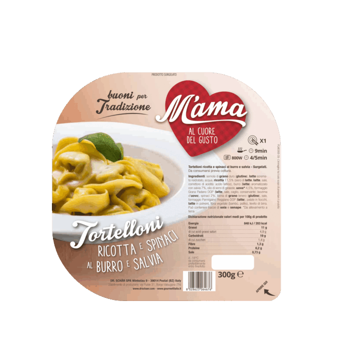 Ingredients: durum wheat semolina (gluten), rehydrated skimmed milk, water, ricotta 11,5% (whey, milk, salt,acidity regulator: lactic acid), flavored butter (milk) with sage 7%, sunflower oil, eggs 4,5%, Grana Padano PDO cheese (milk, salt, rennet, conservative: egg lysozyme), spinach 2%, wheat flour (gluten), salt, Parmigiano Reggiano PDO cheese (milk), flake potatoes, powdered milk, vegetable fiber (bamboo, psyllium), brewer’s yeast. May contain traces of soy and mustard. Free-range.