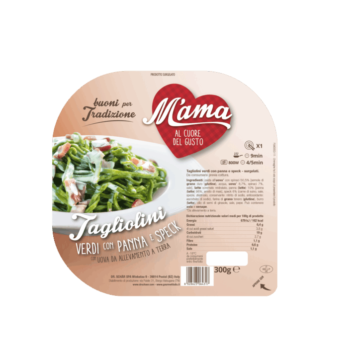 Ingredients: Egg* pasta with spinach 50,5% [durum wheat semolina (gluten), water, eggs* 8,7%, spinach 7%, salt], rehydrated skimmed milk, durum wheat semolina (gluten), cream (milk) 10% [cream (milk) 98%, maize starch], speck 6% (pork meat, salt, spices, dextrose, preservative: sodium nitrite, antioxidant: sodium ascorbate), wheat flour (gluten), butter (milk), sunflower oil, salt, pepper. May contain traces of soy and mustard. *From farm to ground.
