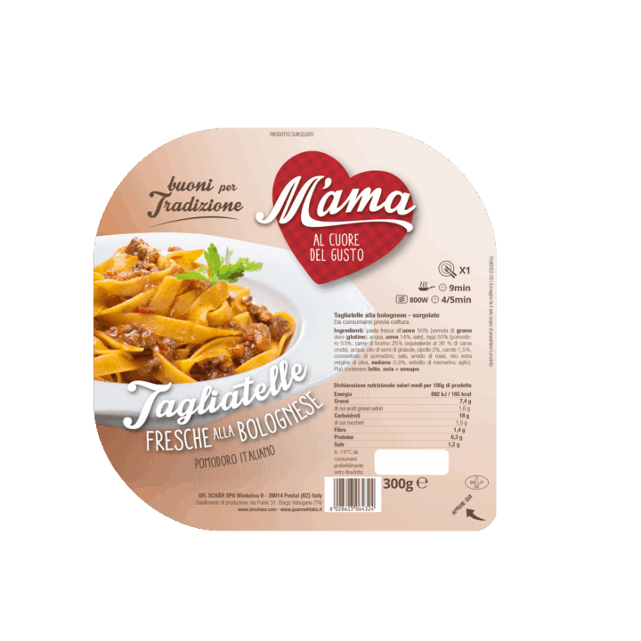 Ingredients: fresh egg pasta 50% [durum wheat semolina (gluten), water, eggs 14%, salt], ragout 50% [tomato 53%, beef 25% (equivalent to 36% raw meat), water, sunflower oil, onions 2%, carrots 1.5%, tomato concentrate, salt, maize starch, extra virgin olive oil, celery 0.9%, rosemary extract, garlic]. May contain traces of milk, soy and mustard.