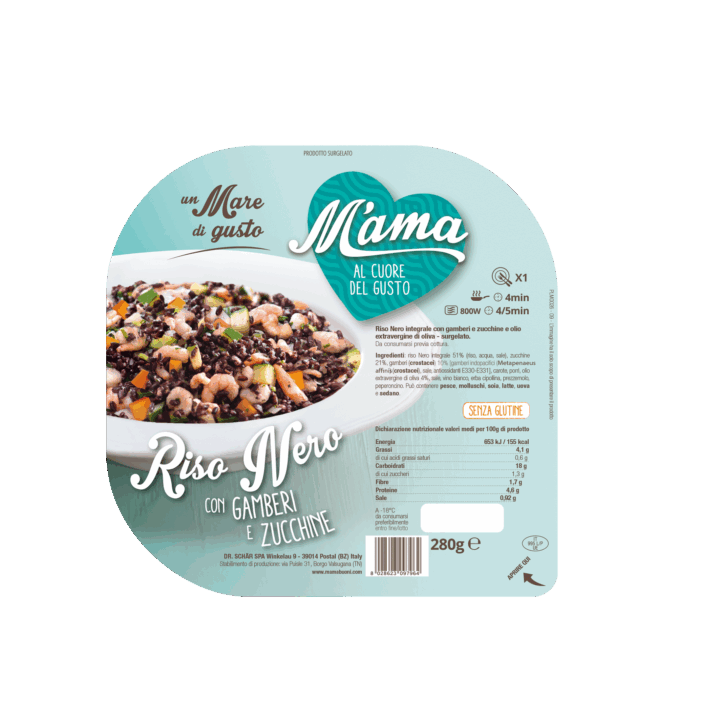 Ingredients: brown Black rice 51% (rice, water, salt), zucchini 21%, prawns (crustaceans) 10% [prawns Indo-Pacific (Metapenaeus affinis) (costaceous), salt, antioxidants E-330-E331], carrots, leeks, extra virgin olive oil 4%, salt, white wine, chives, parsley, chili pepper. May contain traces of fish, shellfish, soy, milk, eggs, and celery.