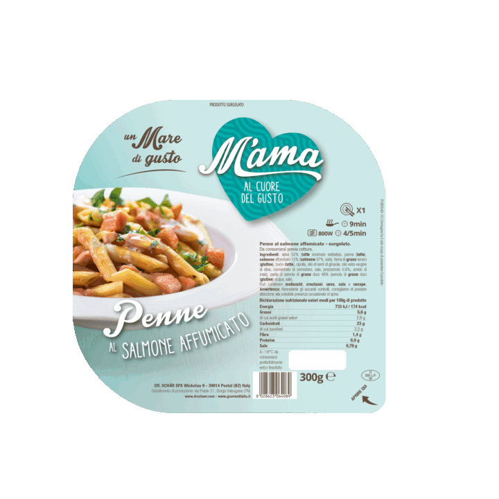 Ingredients: sauce 52% (rehydrated skimmen milk, cream (milk), smoked salmon 12% (salmon 97%, salt), wheat flour (gluten), butter (milk), onion, sunflower oil, extra virgin olive oil, tomato paste, salt, parsley 0.6%, maize starch), durum wheat semolina pasta 48% (durum wheat semolina (gluten) water, salt). May contain mollusks, crustaceans, egg, soy, and mustard. Warning: despite thorough checks, we advise you to beware of the occasional presence of thorns.