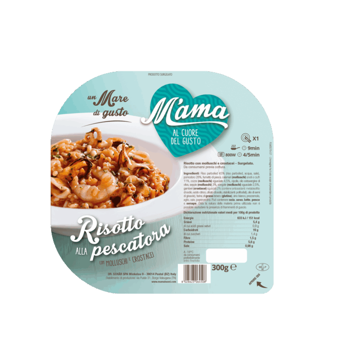 Ingredients: Parboiled rice 43% (parboiled rice, water, salt), tomato 28%, fish stock, squid (molluscs) rings and tentacles 11%, shelled mussels (molluscs) 4,5%, onion, extra virgin olive oil, cuttlefish (molluscs) 3%, shelled clams (molluscs) 2,5%, shelled prawns (crustaceans) 2% (contain antioxidant: sodium metabisulphite, citric acid, sodium citrate, stabilisers: polyphosphates), sunflower oil), soft wheat flour (gluten), white wine, parsley, garlic, salt, chilli pepper. May contain traces of soy, eggs, milk, fish and mustard.